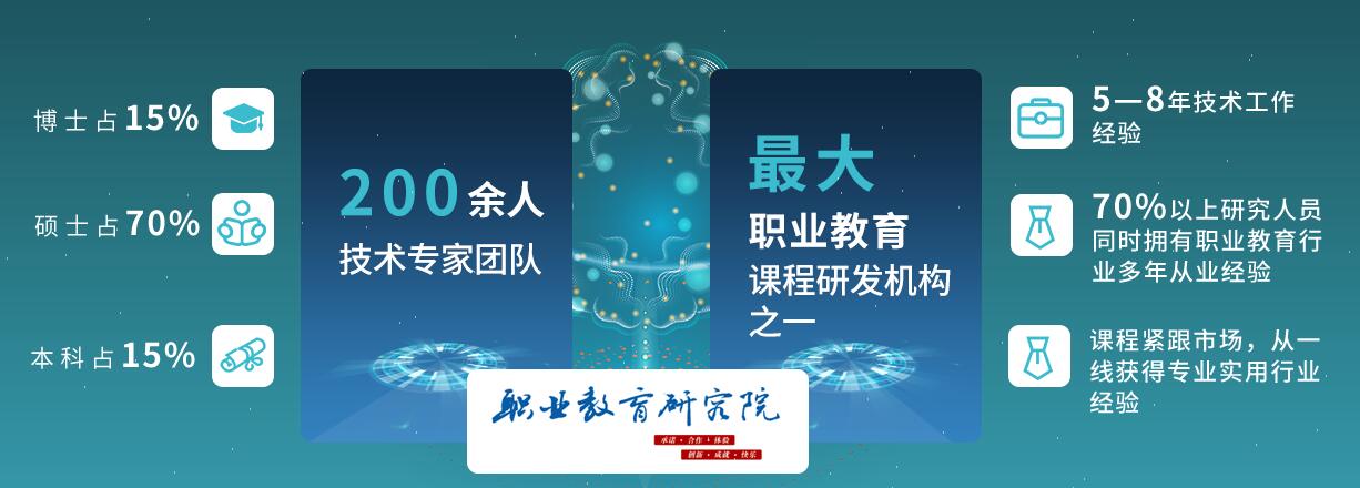 北大青鸟职业研究院,国内规模最大的职业教育课程研发机构之一,目前拥有200余人的技术专家团队,其中博士占15%、本科占15%、硕士占70%。团队成员拥有5到8年企业技术工作经验,70%以上研究人员同时拥有职业教育行业多年从业经验,覆盖教育学、教育技术学、教育心理学行业发展预测等多个专业领域及技术方向,并时刻能从一线获得专业实用的行业经验。职业教育研究院强大的课程产品研发实力成为北大青鸟在IT职业教育领域不断拓展的有力保障。